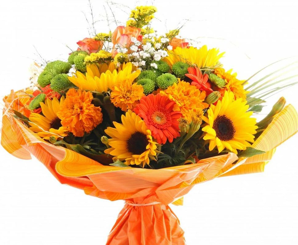 A cheerful bouquet bursting with sunflowers, gerberas, and seasonal greens. Perfect for lifting spirits, congratulating a friend, or simply spreading joy with a reliable flower delivery.