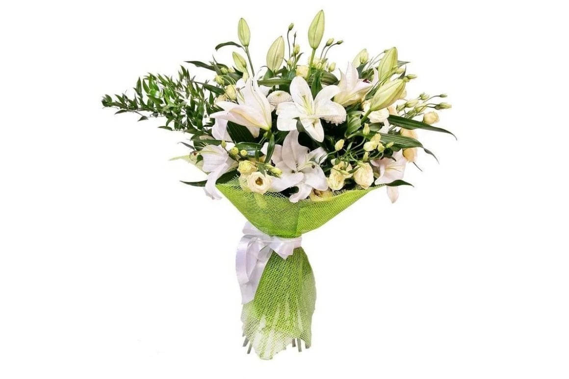 Experience tranquility with this stunning arrangement of white lilies and eucalyptus. Their calming fragrance and pristine beauty make them ideal for creating a peaceful atmosphere or as a thoughtful gesture of sympathy.